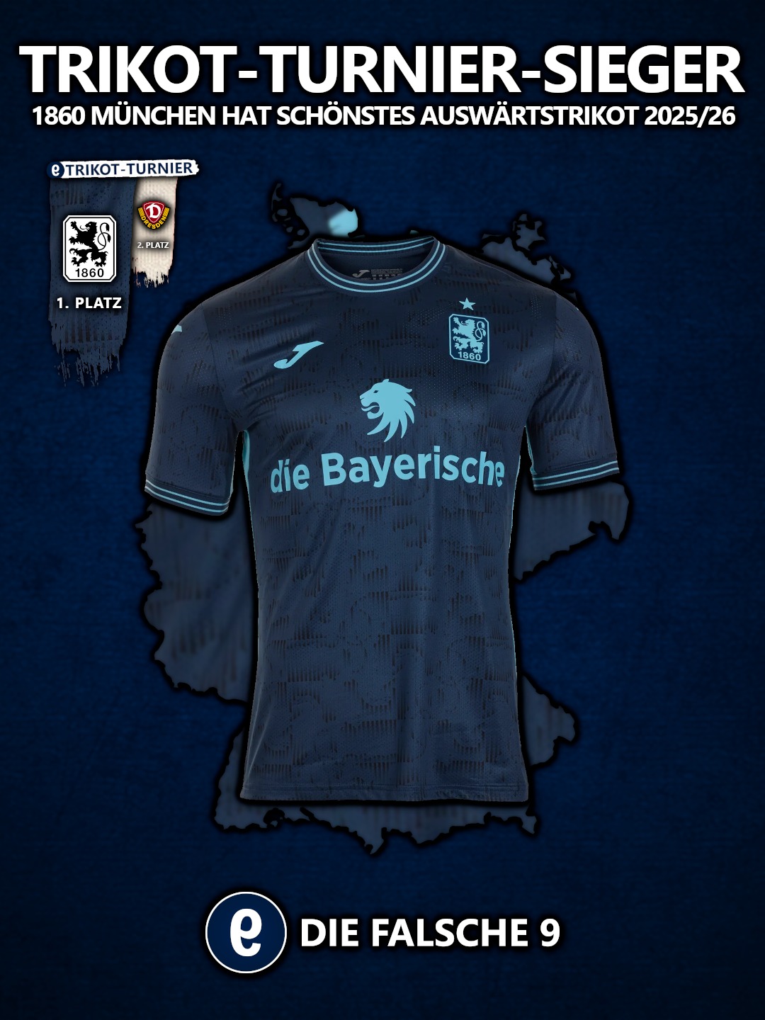 Der TSV 1860 München hat unser Auswärts-Trikot-Turnier 2025/26 gewonnen. Das Löwen-Jersey setzte sich im Finale gegen das Trikot von Dynamo Dresden durch.