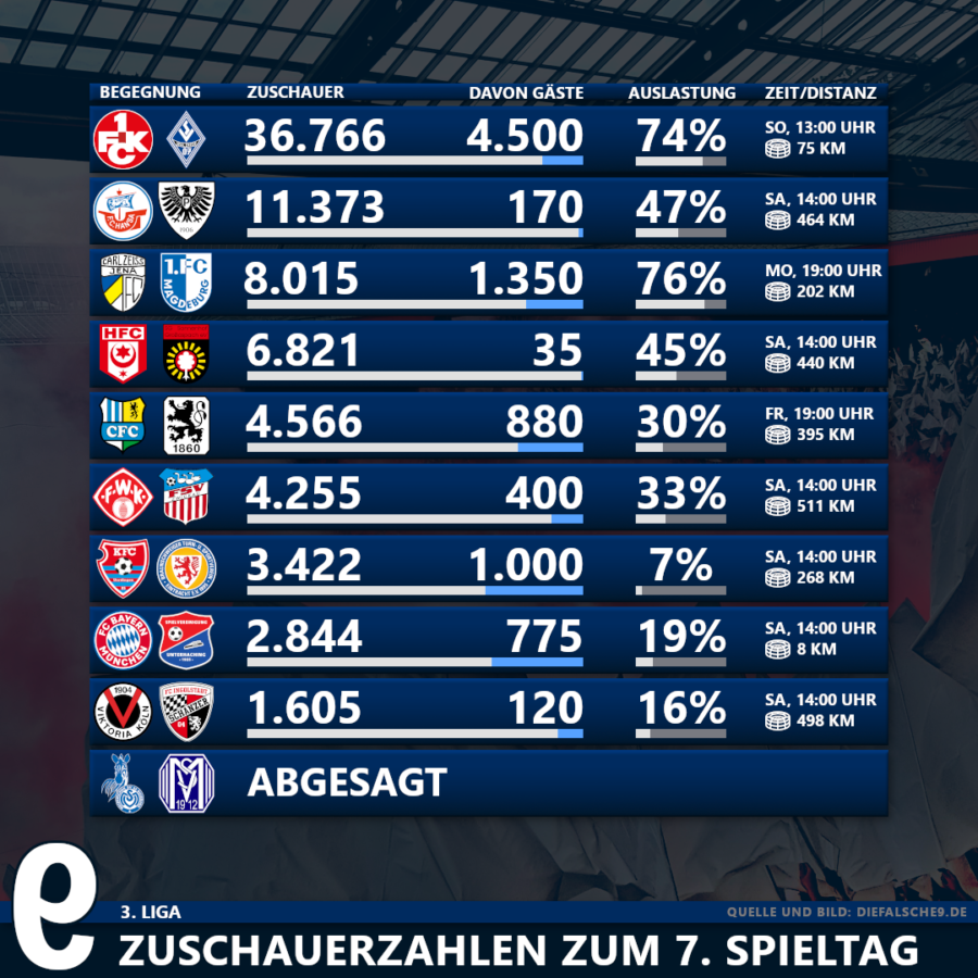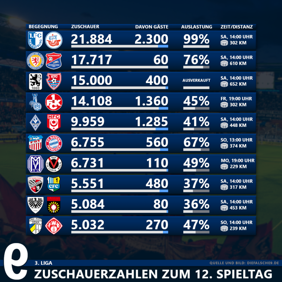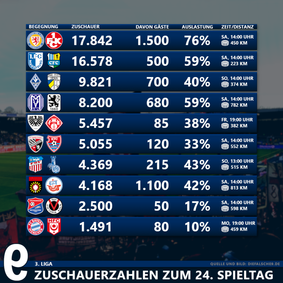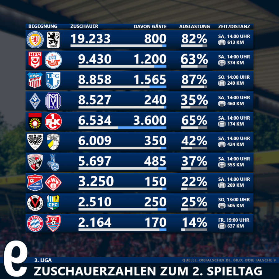 In der Galerie findet ihr alle Spieltage (die vor Zuschauer stattgefunden haben) zum Durchklicken. Bei den Kilometerangaben handelt es sich um die am Spieltag schnellstmögliche Route (per Auto) vom Heim- zum Gaststadion. Aufgrund der Geisterspiele vom 28. bis zum 38. Spieltag endet die Galerie mit dem 27. Spieltag.