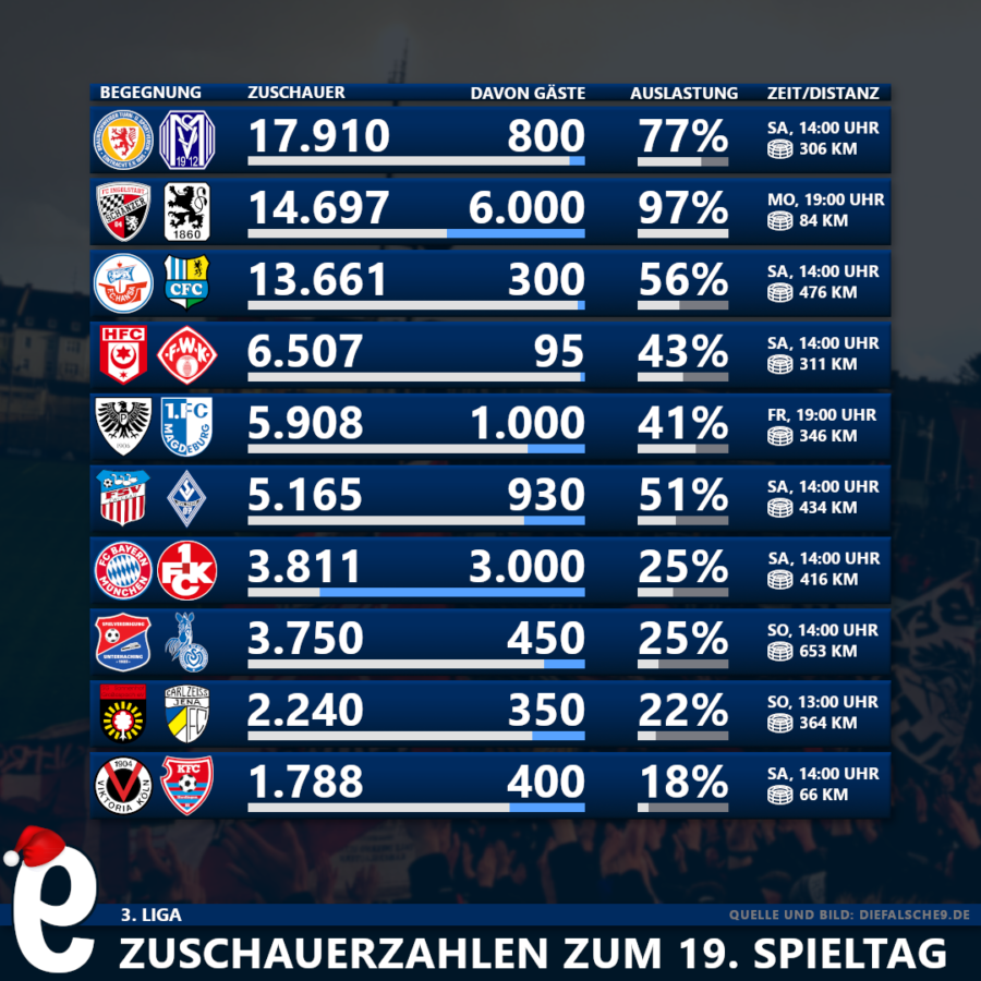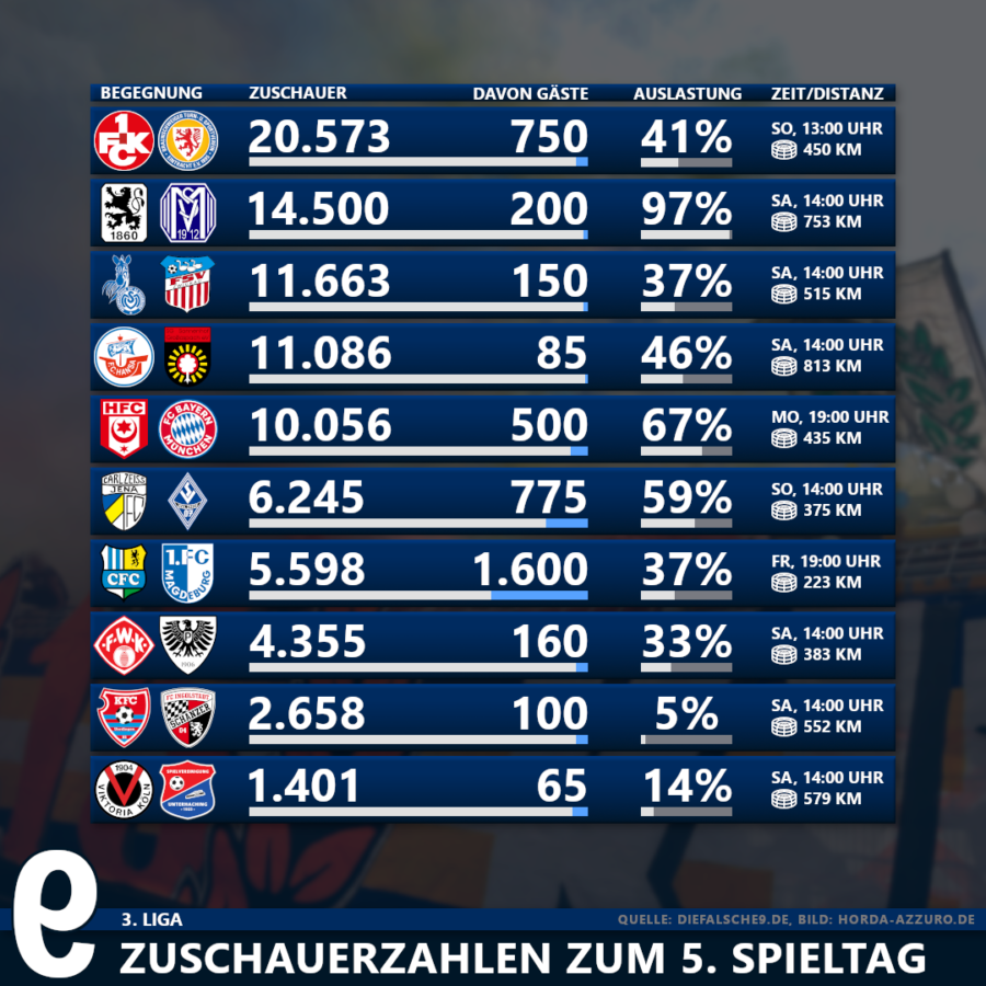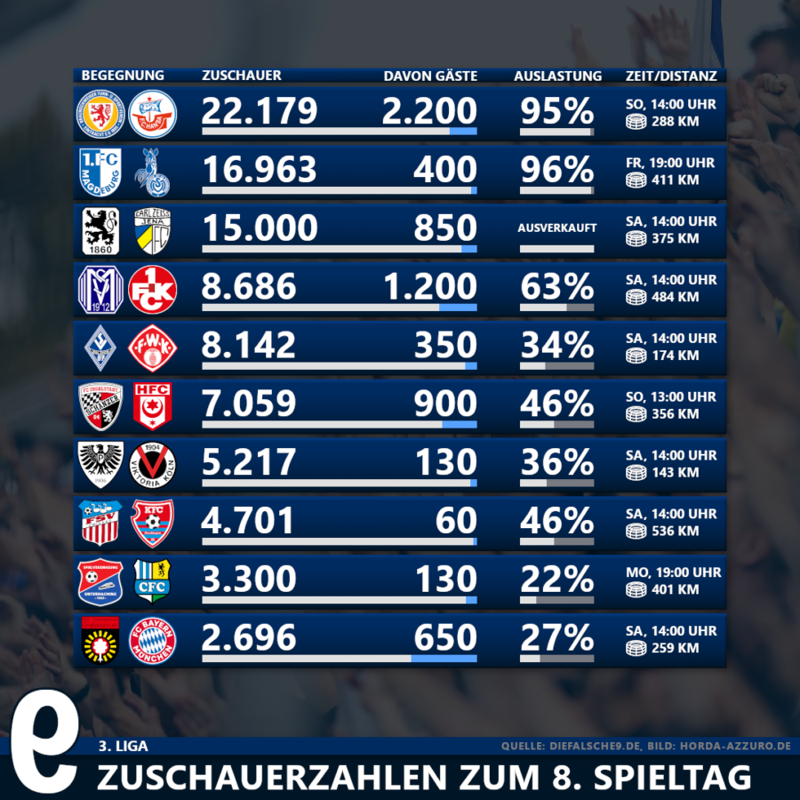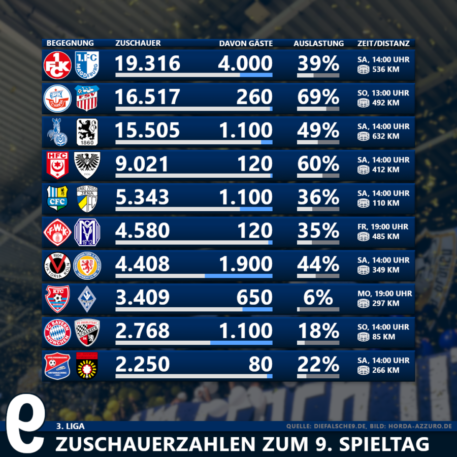 In der Galerie findet ihr alle Spieltage (die vor Zuschauer stattgefunden haben) zum Durchklicken. Bei den Kilometerangaben handelt es sich um die am Spieltag schnellstmögliche Route (per Auto) vom Heim- zum Gaststadion. Aufgrund der Geisterspiele vom 28. bis zum 38. Spieltag endet die Galerie mit dem 27. Spieltag.