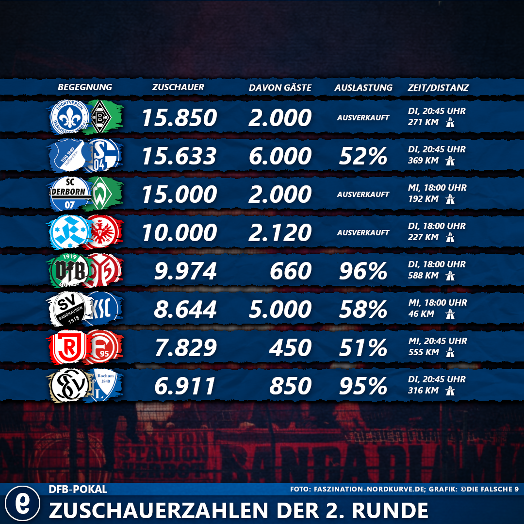 Durchschnittlich 20.614 Zuschauer besuchten die Zweitrundenpartien im DFB-Pokal. Die Stadionauslastung lag damit bei durchschnittlich 84%. Insgesamt waren über 45.000 Gästefans unterwegs.