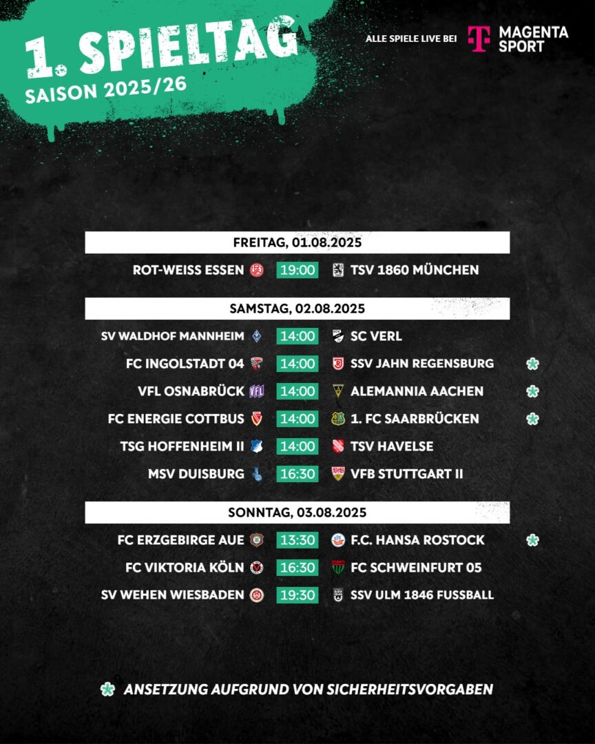 Nachdem der DFB in der vergangenen Woche den Spielplan der 3. Liga veröffentlicht hat, folgen in dieser Woche die ersten zeitgenauen Ansetzungen. Terminiert wird der 1. und 2. Spieltag der neuen Saison. Die 3. Liga startet am 1. August an der Hafenstraße in Essen in die neue Saison. Das Eröffnungsspiel gegen die Münchner Löwen wird live und frei empfangbar bei Magenta Sport übertragen – Anstoß ist um 19:00 Uhr. Im Vergleich zur Vorsaison gibt es keine Änderung bei den Anstoßzeiten. Weiterhin gibt es ein Spiel am Freitagabend, fünf Spiele am Samstag um 14:00 Uhr sowie das Einzelspiel um 16:30 Uhr. Am Sonntag wird um 13:30 Uhr, 16:30 Uhr und 19:30 Uhr je eine Partie angepfiffen. Update: Die Ansetzungen sind da!
