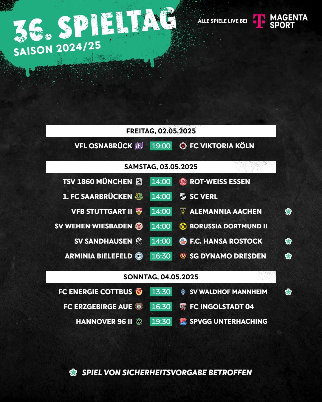 Am vorletzten Spieltag könnten im Aufstiegskampf möglicherweise die ersten Entscheidungen fallen. Für alle Mannschaften aus den aktuellen Top 3 stehen schwere Auswärtsspiele an. Dynamo Dresden gastiert bei Waldhof Mannheim, Energie Cottbus bei Hansa Rostock und der 1. FC Saarbrücken bei Alemannia Aachen. Im Kampf um den Klassenerhalt kommt es zum direkten Duell der derzeit stärksten Mannschaften der Rückrunde. Der VfL Osnabrück reist zum Auswärtsspiel bei Rot-Weiss Essen.