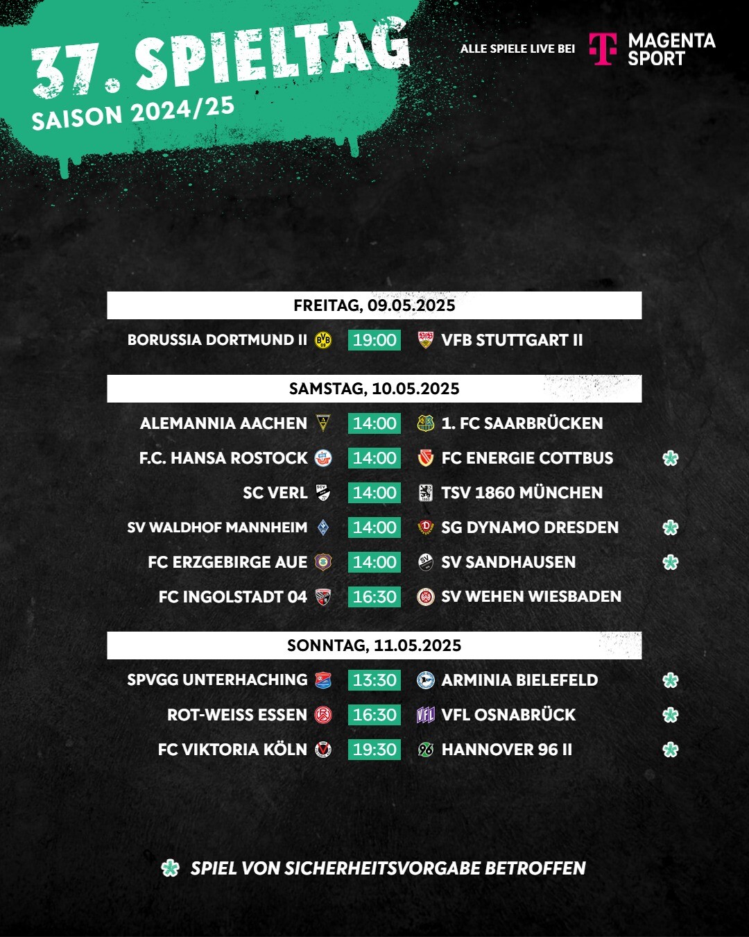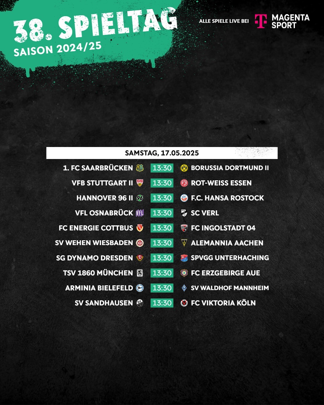 Am letzten Spieltag haben die Aufstiegsfavoriten dann allesamt ein Heimspiel. In Dresden gastiert Unterhaching, in Cottbus der FC Ingolstadt und in Saarbrücken Borussia Dortmund II. Verfolger Arminia Bielefeld bestreitet sein letztes Spiel der Drittligasaison gegen Waldhof Mannheim. Im Anschluss daran steht mindestens noch das Westfalenpokalfinale an. Hinzukommen könnten noch das DFB-Pokalfinale und die Relegation um den Aufstieg in die 2. Bundesliga.