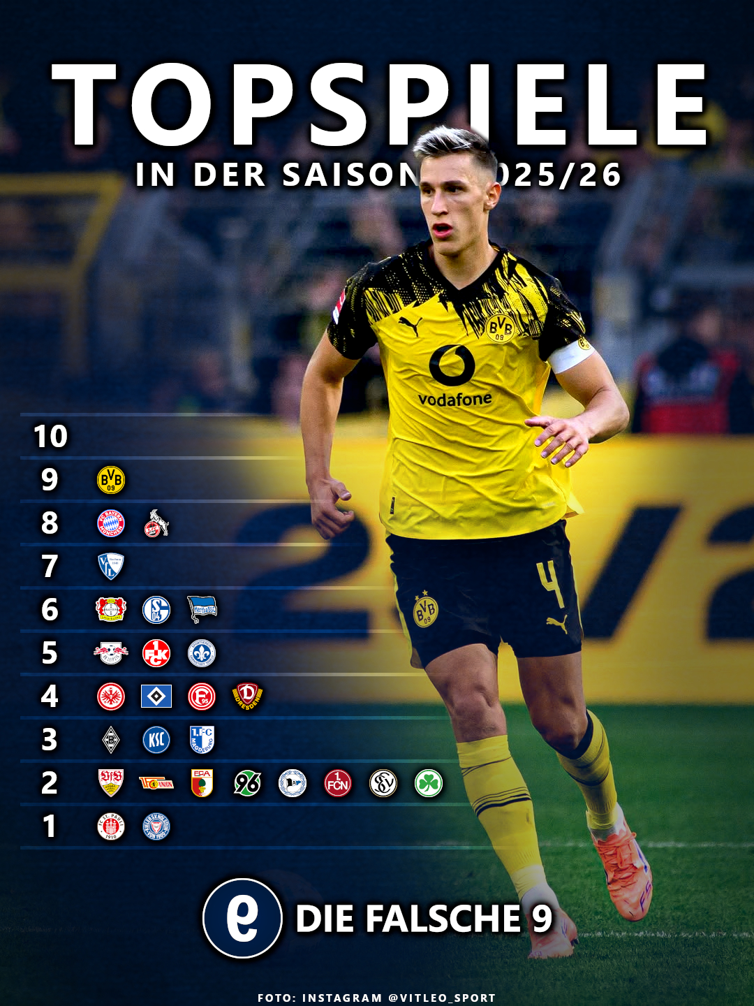 Noch komplett ohne Topspiel-Ansetzung sind die TSG Hoffenheim, der SC Freiburg, SV Werder Bremen, VfL Wolfsburg, 1. FC Heidenheim und 1. FSV Mainz 05. Für die TSG käme einzig die Partie gegen den BVB als Topspiel-Kandidat in Betracht. Der SV Werder Bremen könnte sein erstes Topspiel gegen den Hamburger SV bestreiten – sofern die Sicherheitsbehörden kein Veto einlegen. Da am 30. Spieltag bereits alle Sonntagsspiele durch die Europapokal-Teilnehmer belegt sind, findet das Nordderby am Freitag oder Samstag statt.