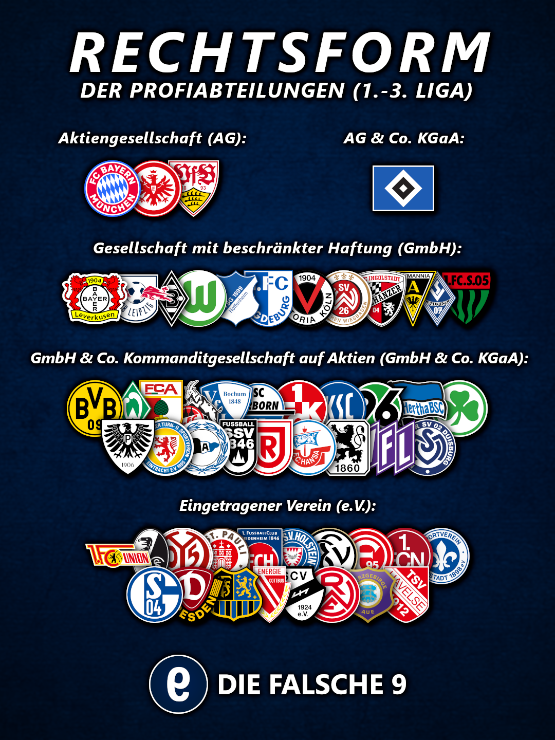 Die 54 Profiabteilungen der Vereine aus den ersten drei deutschen Ligen haben insgesamt fünf verschiedene Rechtsformen. Die meisten Vereine haben sich für eine Ausgliederung ihrer Lizenzspielerabteilung in eine GmbH & Co. KGaA entschieden. Immerhin 18 Vereine haben sich bislang gegen eine Ausgliederung der Profiabteilung entschieden und stellen sich dem Wettbewerb als Eingetragener Verein. Im folgenden stellen wir die verschiedenen Rechtsformen dar.