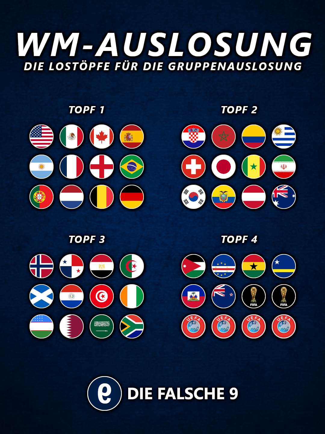 Die deutsche Fußball-Nationalmannschaft wird bei der Auslosung der WM 2026 aus dem ersten Lostopf gezogen. Für Österreich steht seit Dienstag fest, dass sich die Mannschaft von Ralf Rangnick im zweiten Lostopf befindet. Bis zuletzt war offen, ob die Österreicher aus dem zweiten oder dritten Lostopf gezogen werden. Da die FIFA aber alle Play-Off-Teilnehmer im vierten Lostopf platziert hat, geht es für die Rot-Weiß-Roten in Topf 2. Italien wäre bei einer möglichen Qualifikation damit im letzten Lostopf. Die Squadra Azzurra trifft in den Play-Offs zunächst auf Nordirland. Im Finale wartet ein Auswärtsspiel auf den Sieger des Halbfinales zwischen Wales und Bosnien und Herzegowina.