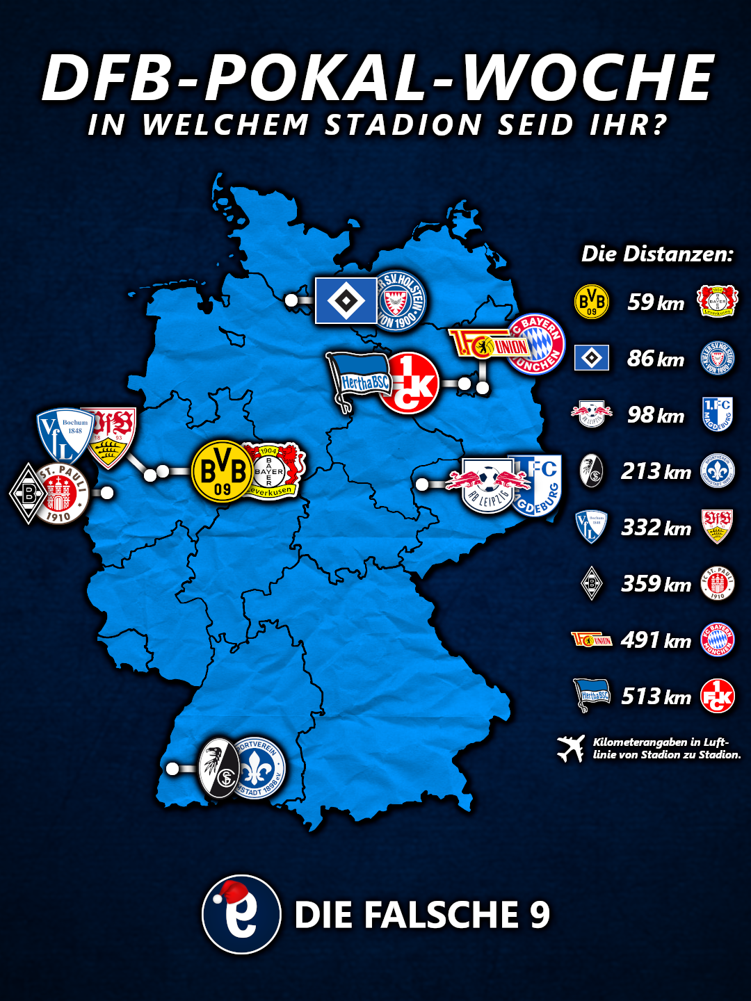 Über 500 Kilometer Luftlinie trennen das Olympiastadion vom Fritz-Walter-Stadion. Zwischen keinen anderen Stadien der Achtelfinal-Duelle liegen mehr Kilometer. Für die FCK-Fans steht damit die längste Auswärtsfahrt im Achtelfinale an. Rund 650 Kilometer Autostrecke müssen bis zur Bundeshauptstadt zurückgelegt werden. An die Grenzen von Berlin kam man auch in dieser Saison schon. In der 1. DFB-Pokal-Runde gastierte die Lieberknecht-Elf beim RSV Eintracht 1949, die das Pokalspiel im Karl-Liebknecht-Stadion in Babelsberg (Potsdam) austrug. Mit dabei waren rund 4.000 Gästefans. Der Einzug ins Achtelfinale gelang in Fürth. Die Hertha setzte sich in der ersten Pokalrunde in Münster durch und gewann anschließend das Heimspiel gegen Elversberg.