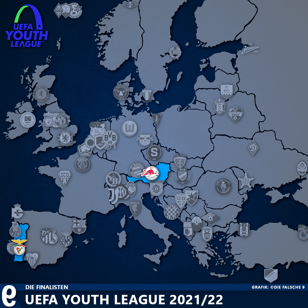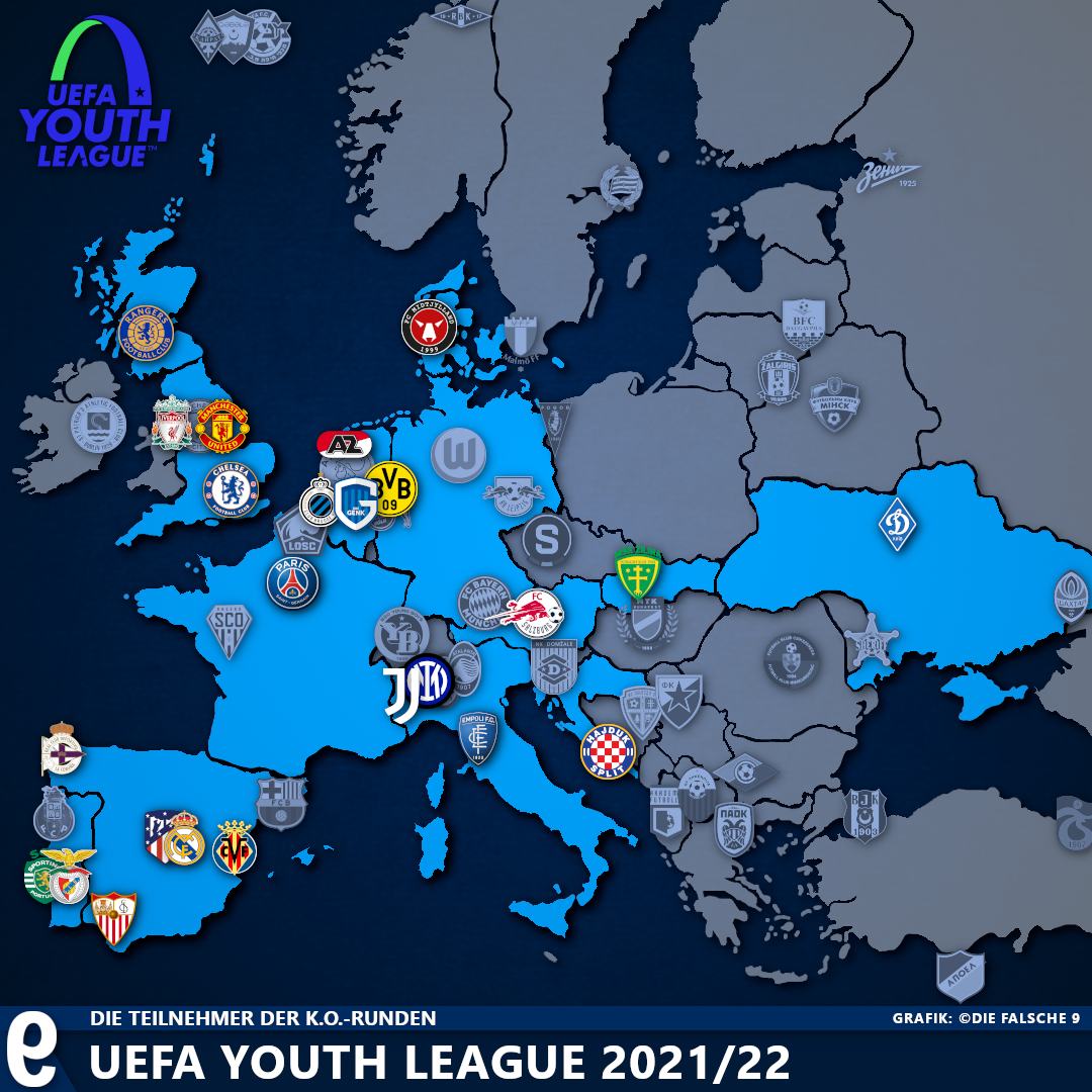 Auch in der UEFA Youth League rollt wieder der Ball! Nachdem die U19-Mannschaften der UEFA-Champions-League-Teilnehmer 2021/22 parallel zur Champions League in die Gruppenphase gestartet sind, starteten Ende September auch die Erstrundenspiele der 32 Klubs statt, die sich über die U19-Liga ihres Landes qualifiziert haben. Wir haben euch alle 64 Teilnehmer der UEFA Youth League 2021/22 auf unserer Karte dargestellt.