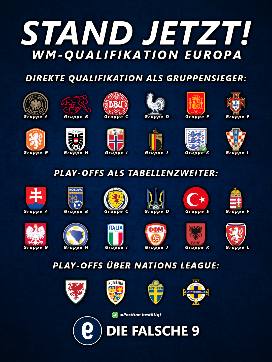 Völlig neben sich steht momentan Schweden mit der eigentlich hochveranlagten Offensive um Alexander Isak und Viktor Gyökeres. Durch den Gruppensieg in der Nations League wäre Tre Kronor Stand jetzt! trotzdem für die Play-Offs qualifiziert. Dort würde nach der Entlassung von Jon Dahl Tomasson ein neuer Trainer an der Seitenlinie stehen. Auf keinen Fall in Nordamerika dabei wären derzeit zum Beispiel Serbien und Israel. Auch die Färöer, die im Oktober mit einem Sieg gegen Tschechien aufhorchen ließen, haben nur eine geringen Chance auf die WM.